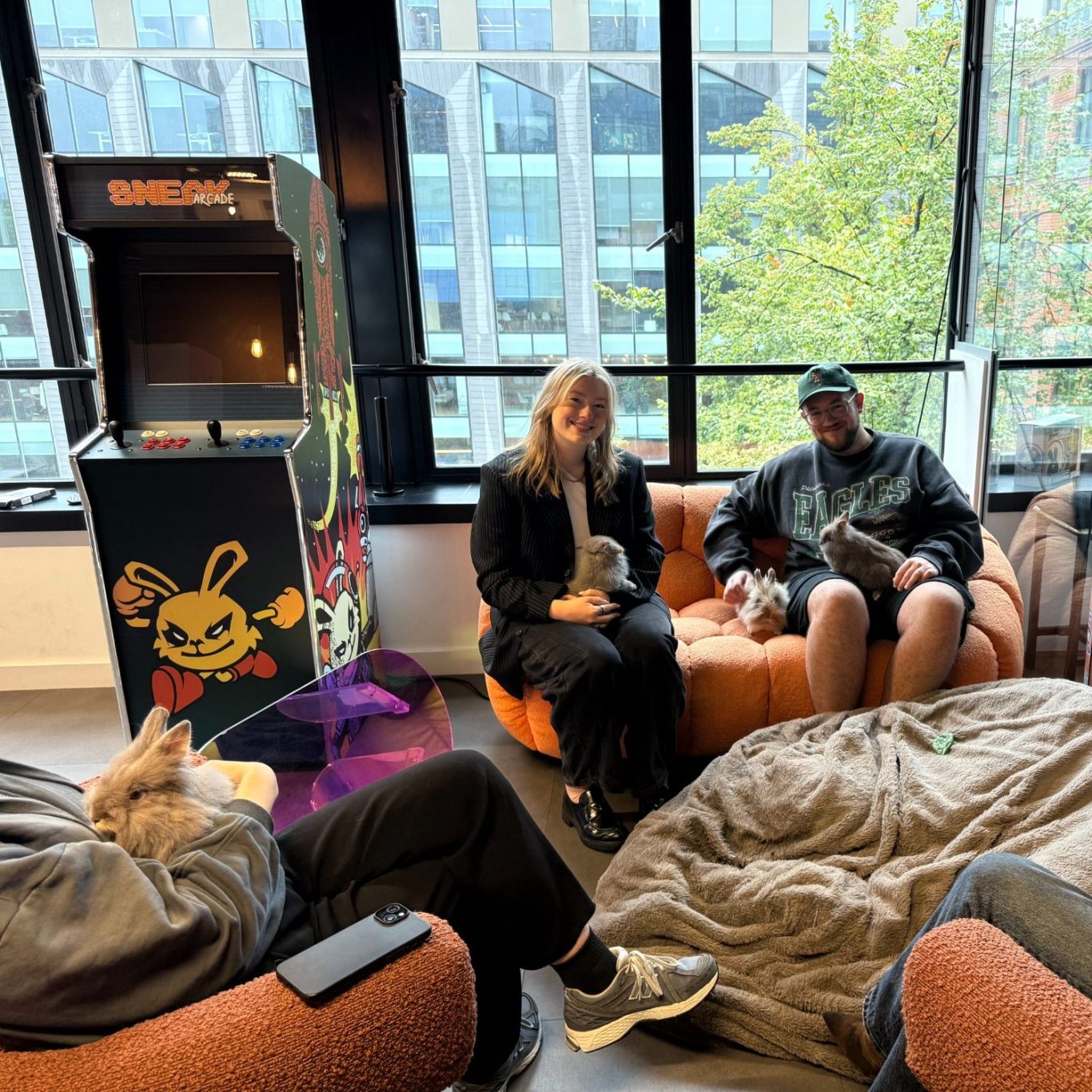 Rabbits and sausage dogs provide a joyful serotonin boost through gentle interaction at your workplace.